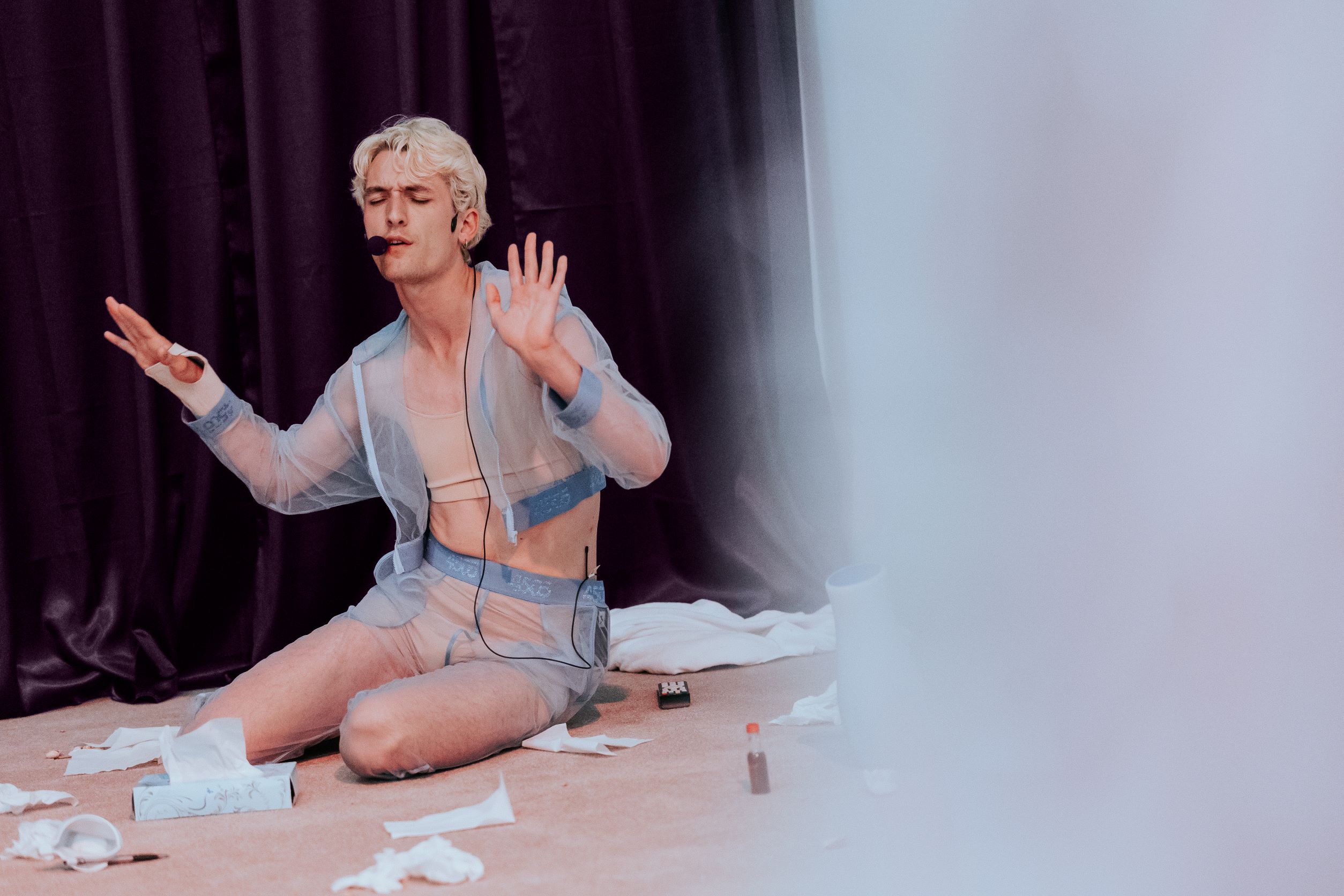 Filip Vest (DK, b. 1995)holds an MFA from Malmö Art Academy. Through performances, installations, films, and texts, they examine queer love, loneliness, and desire in the 21st century. Applying rehearsal methods from theatre, they test the relationship between the script and the body to inve- stigate the different ways we perform our identities and relations. Vest’s universe is inhabited by a vast network of things of different scales, each affecting the other: climate change and crumbling relationships, role play, doomsday karaoke and re-enacted kisses, a bird falling in love with a statue, and a frog having a breakdown in the middle of a striptease. Through mobile phones, walls and windows, the characters communicate and miscommunicate across species and time while attempting to make themselves legible to each other.
