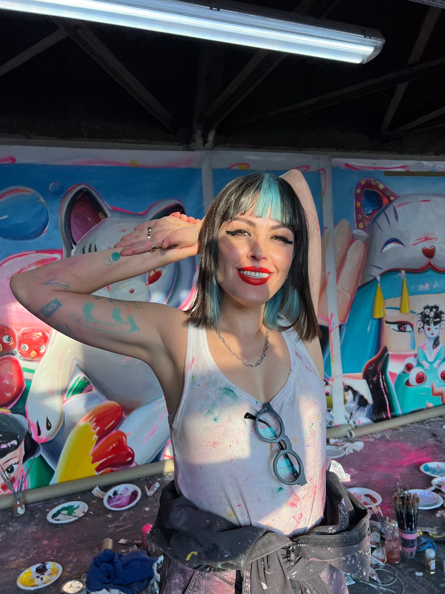 Rokkaku’s visual language seamlessly shifts between elusive abstract formations and figurative elements, drawing inspiration from the kawaii (cute) culture and capturing the boundless imagination of a child. Rokkaku is known for her colourful canvases populated by imaginary landscapes and fantastical characters.