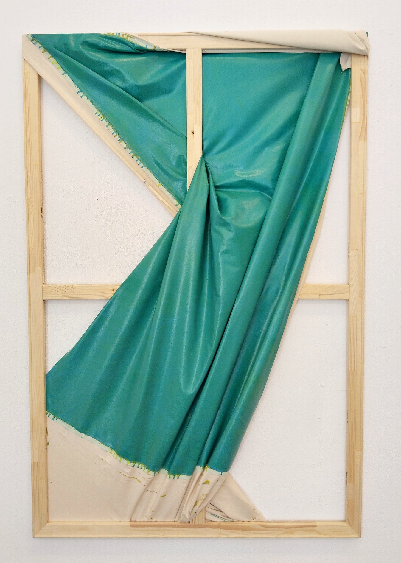 In her painting practice, Franziska Reinbothe develops a process based on folding the canvas, exposing the frame without restraint. The very support of the painting—the stretcher, the canvas, the layering process— are taken into account as a whole and considered horizontally to propose an artwork that unfolds before us. The front, back, and edges of the piece are revealed without distinction or hierarchy.