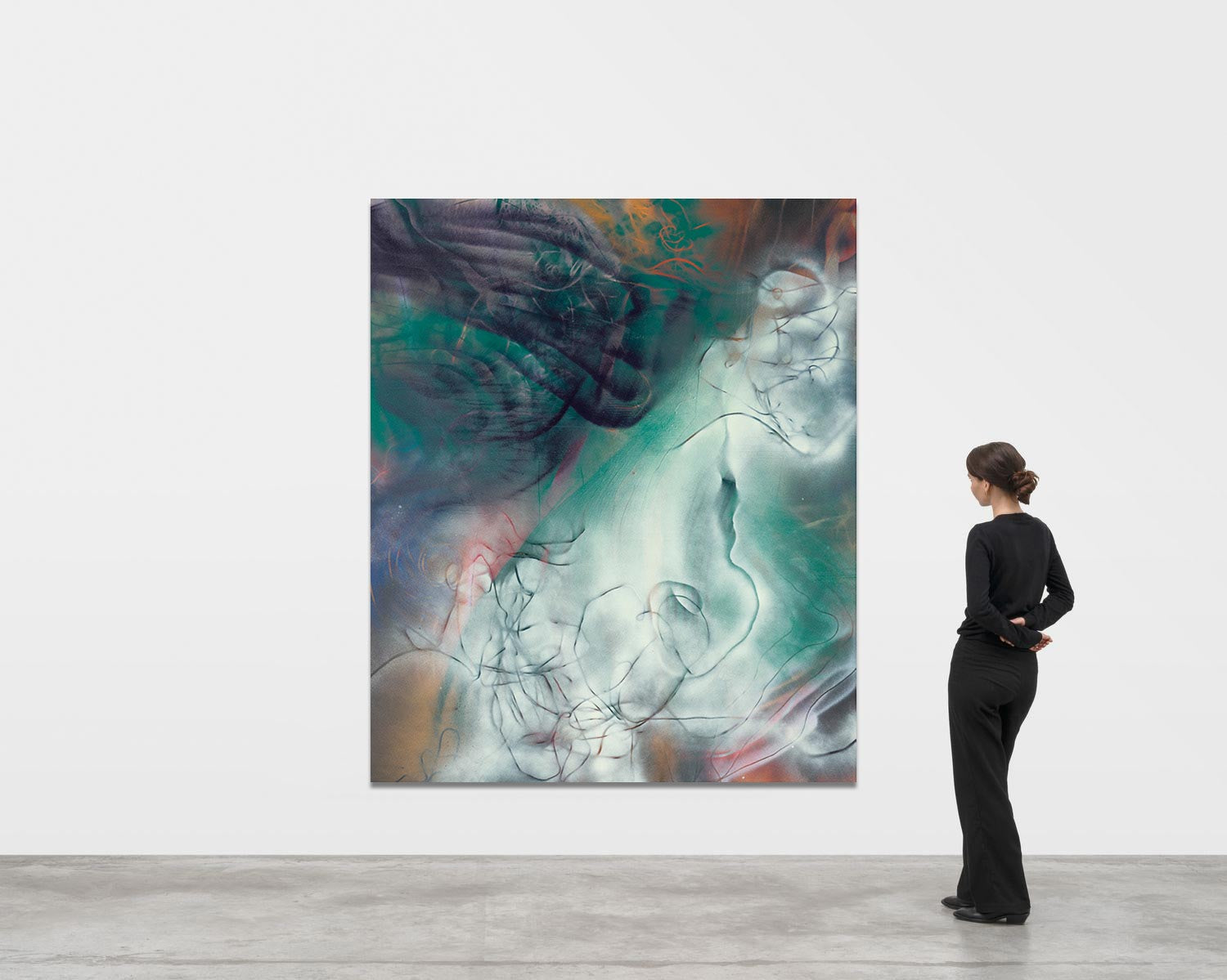 As we move through the exhibition hall, the journey gradually cools, as if we were walking from the hot sand to the coolness of the sea, where our feet touch the water for the first time in summer. The paintings begin to contrast in colors and movements, becoming more organic and wilder, like a mane dancing in the wind on a summer day.