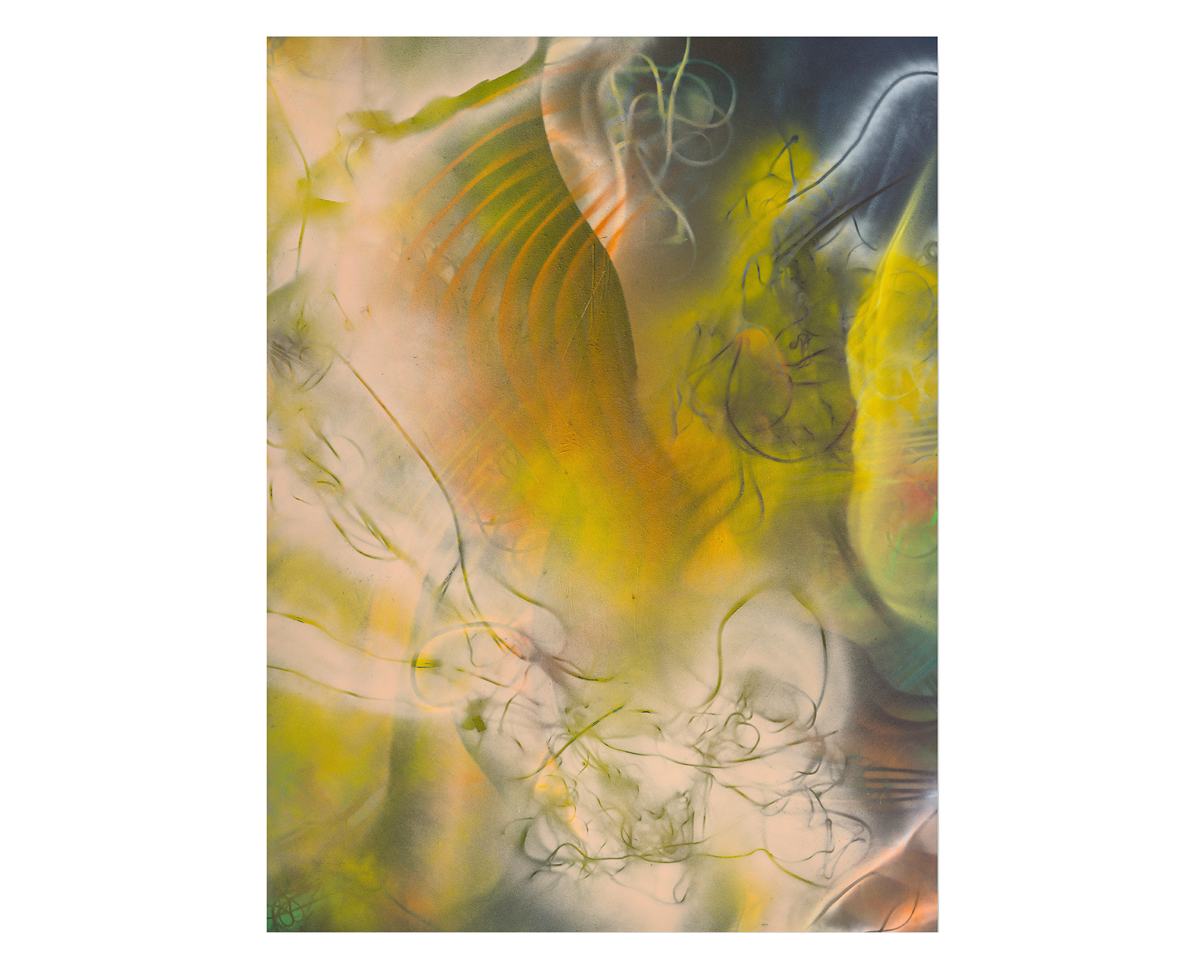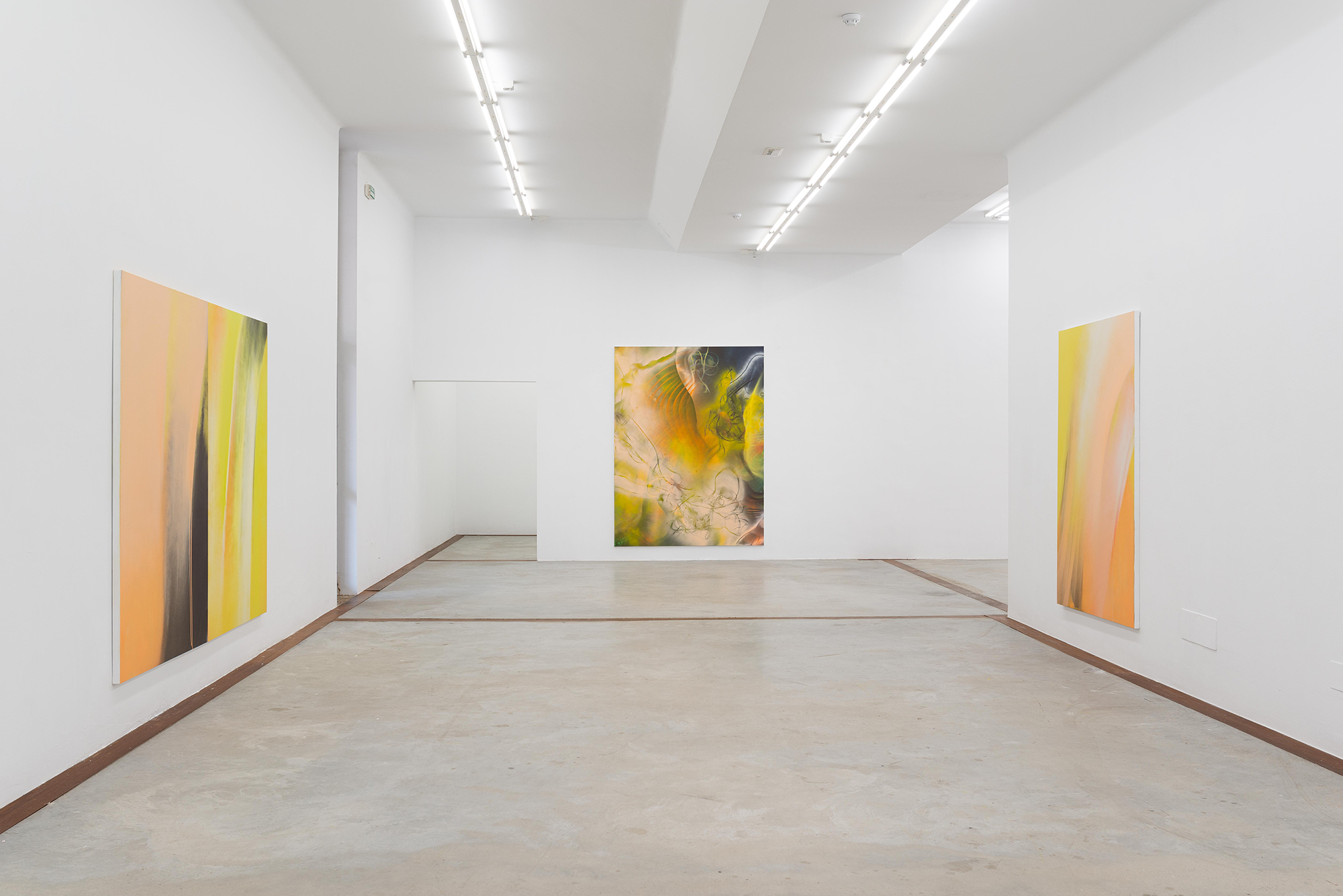 Andrea, in this exhibition, gently takes us by the hand and leads us through her vision of the island, a warm and welcoming land where the strokes of spray paint reflect in our eyes like flashes of sunlight. As we enter the room, we are greeted by an explosion of vitamin D, with warm shades of yellow and orange flooding the white cube and enveloping us in an atmosphere of light and warmth. The cream tones adhere to our skin like grains of sand, inviting us to immerse ourselves in the work “Labored Breath (the stone sets with you), 2024”. The black rays that cross the canvas resemble the momentary blindness caused by the intense sunlight, an intensity that blinds us and makes us squint to glimpse the daylight through our fingers.