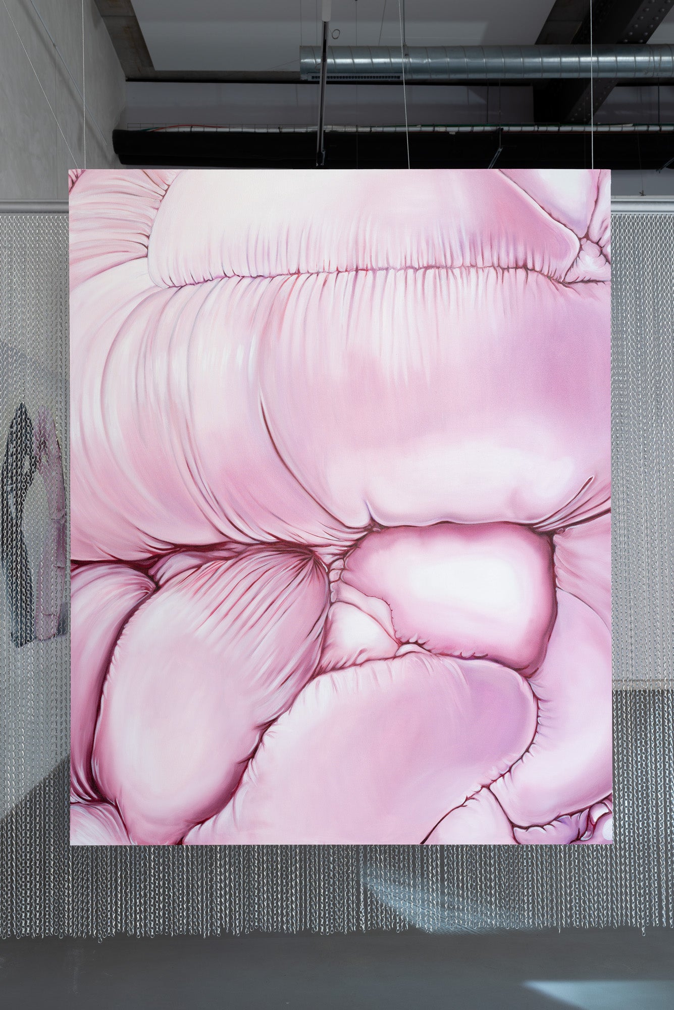 Charlie Stein’s artistic practice investigates the representation of the body as an ambiguous territory, where the organic and the artificial intertwine in a continuum of aesthetic and emotional tensions. In this new series, created specifically for this exhibition at La Misericòrdia on the occasion of La Nit de l’Art 2025, the forms unfolding on her canvases evoke both bodily folds and synthetic surfaces, situated on the threshold between the human and the posthuman. The figures seem trapped in an embrace that is also a struggle, an intimate gesture that is at once unsettling.