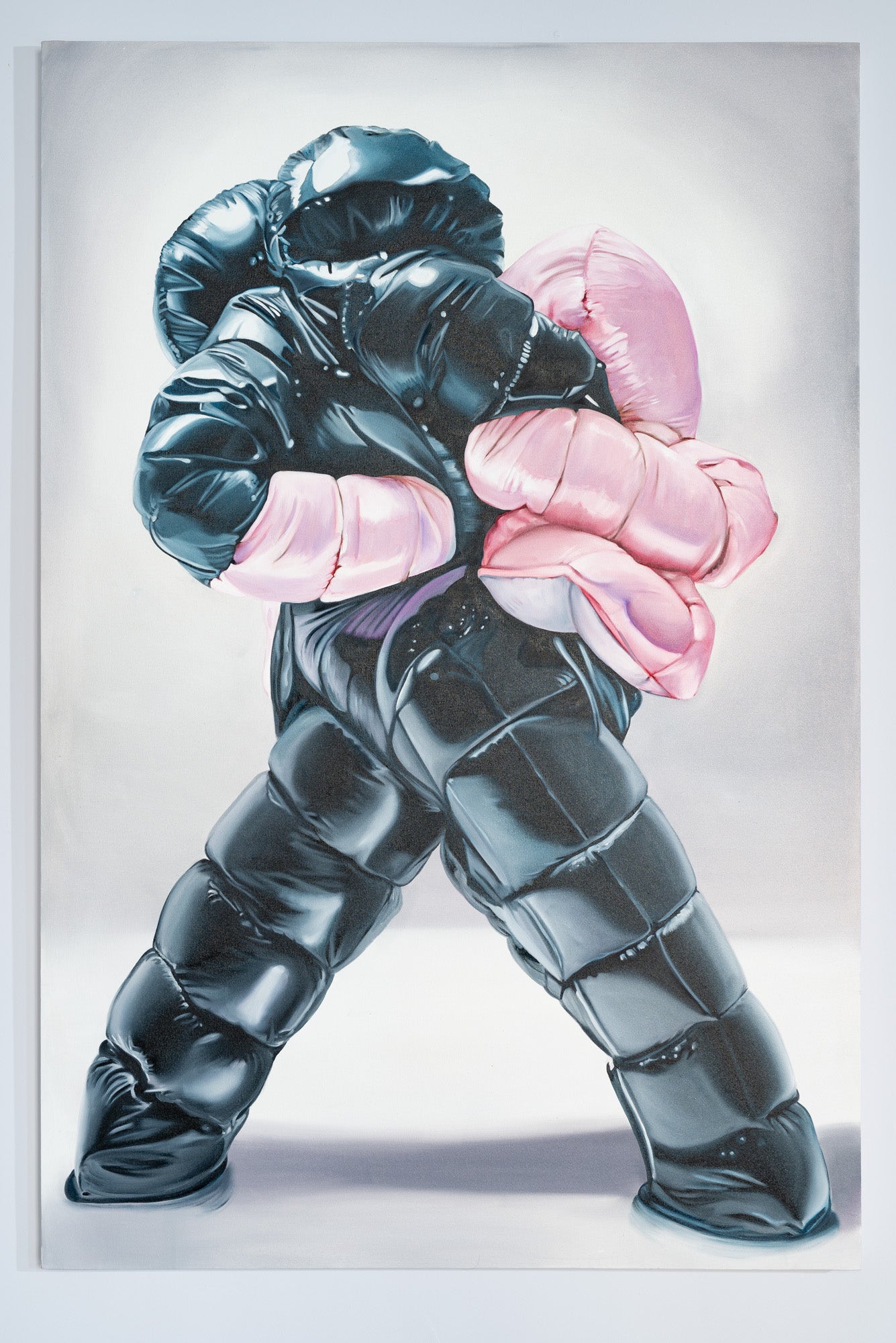 Thus we enter Charlie Stein’s pictorial world, where we intuit the fragility of bodies beneath the padded bulk of garments that serve as protective armor. What kind of beings inhabit these glossy acrylic bodies? Do they belong to a human or posthuman world? For them, does shaking hands mean the same thing?
