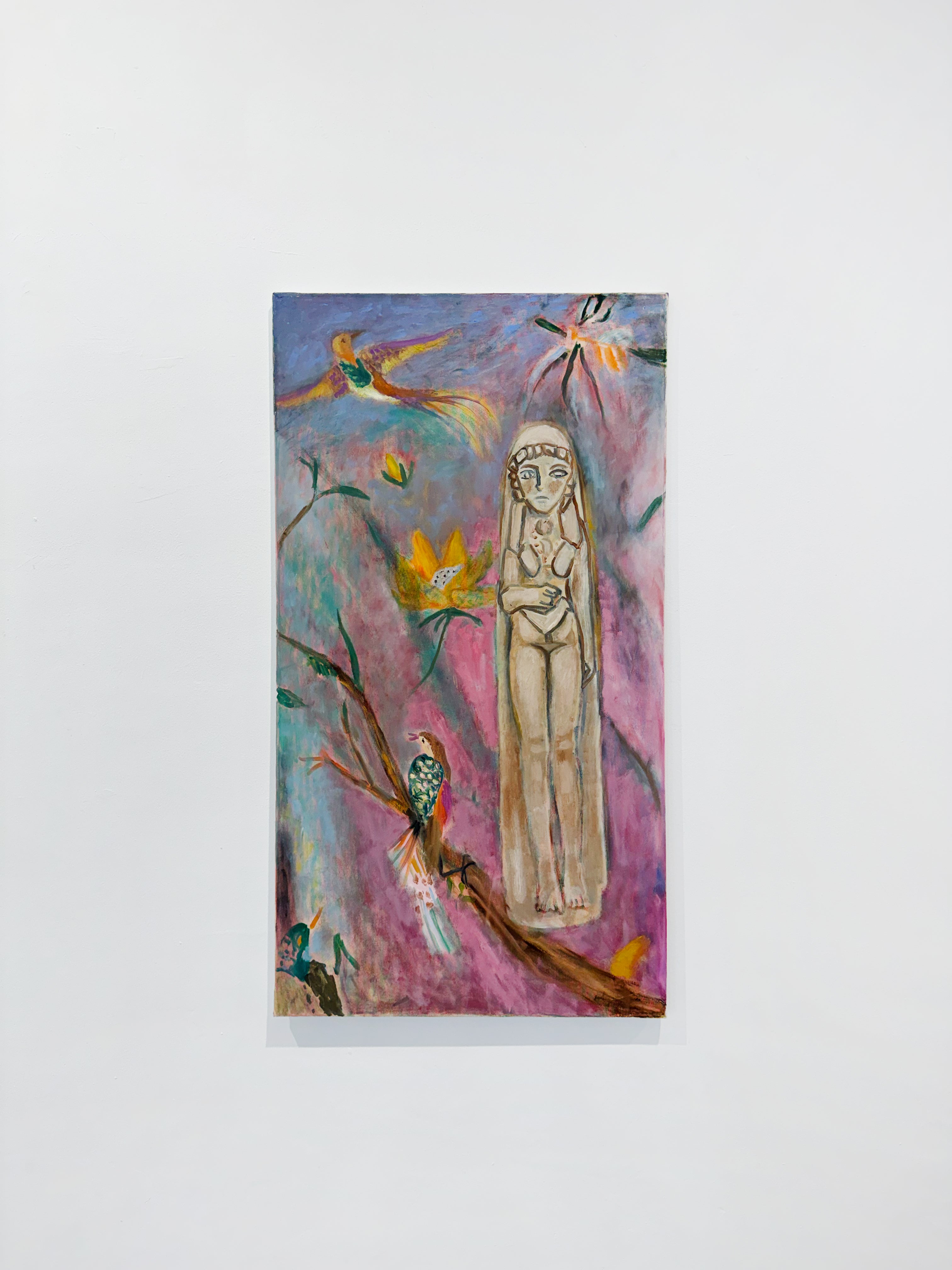 The works are multifaceted but primarily revolve around the female experience, and one can sense an underlying critique of the forces that have shaped the time and world we find ourselves in today. Nature has always played an important role in her motifs, but recently everyday objects, arranged in still life–like compositions, have begun to merge with the landscape, disrupting the distinction between interior and exterior space within the picture. This serves as an exploration of how our