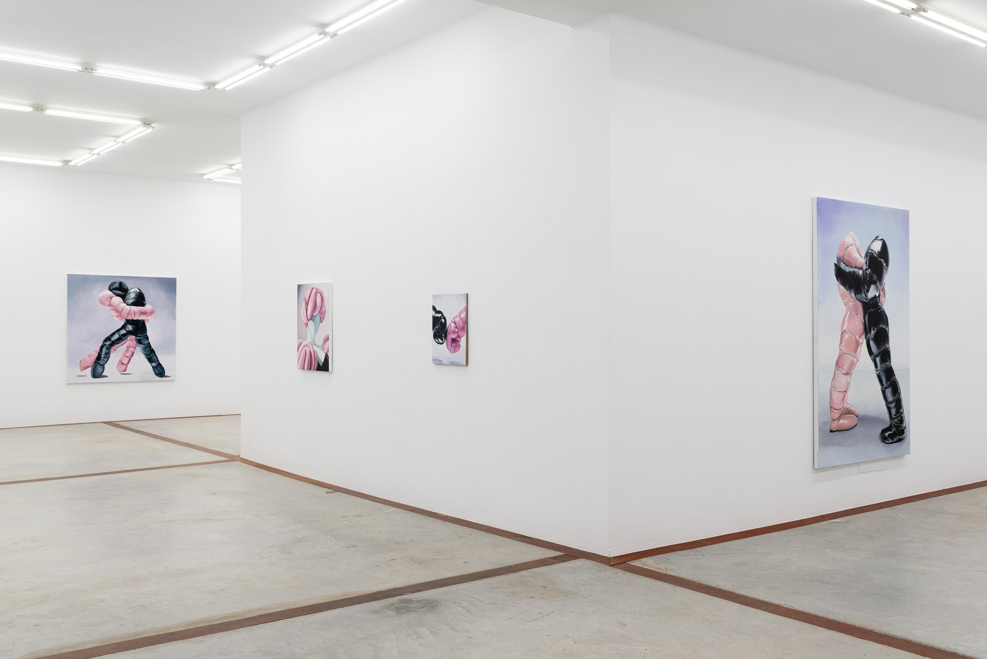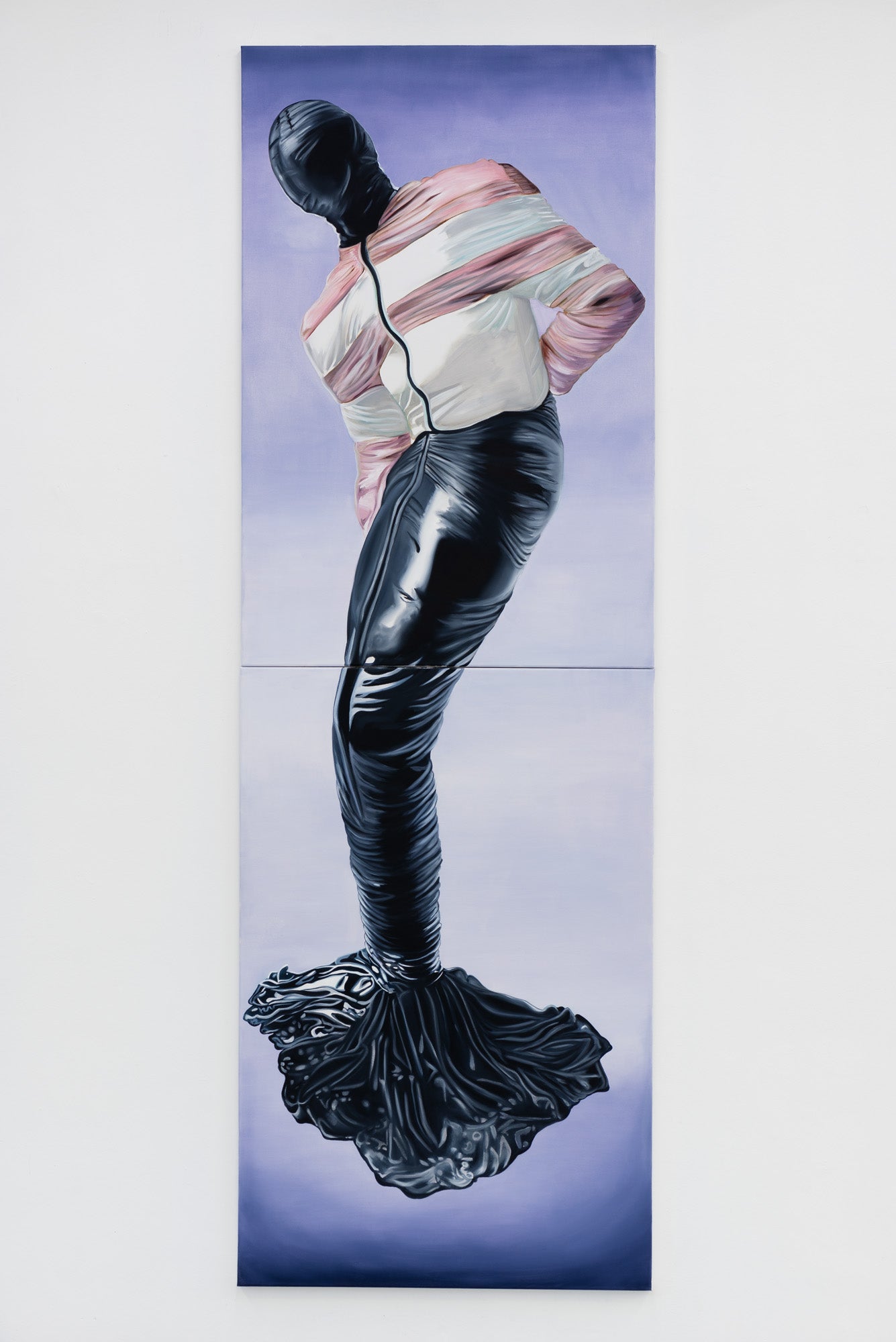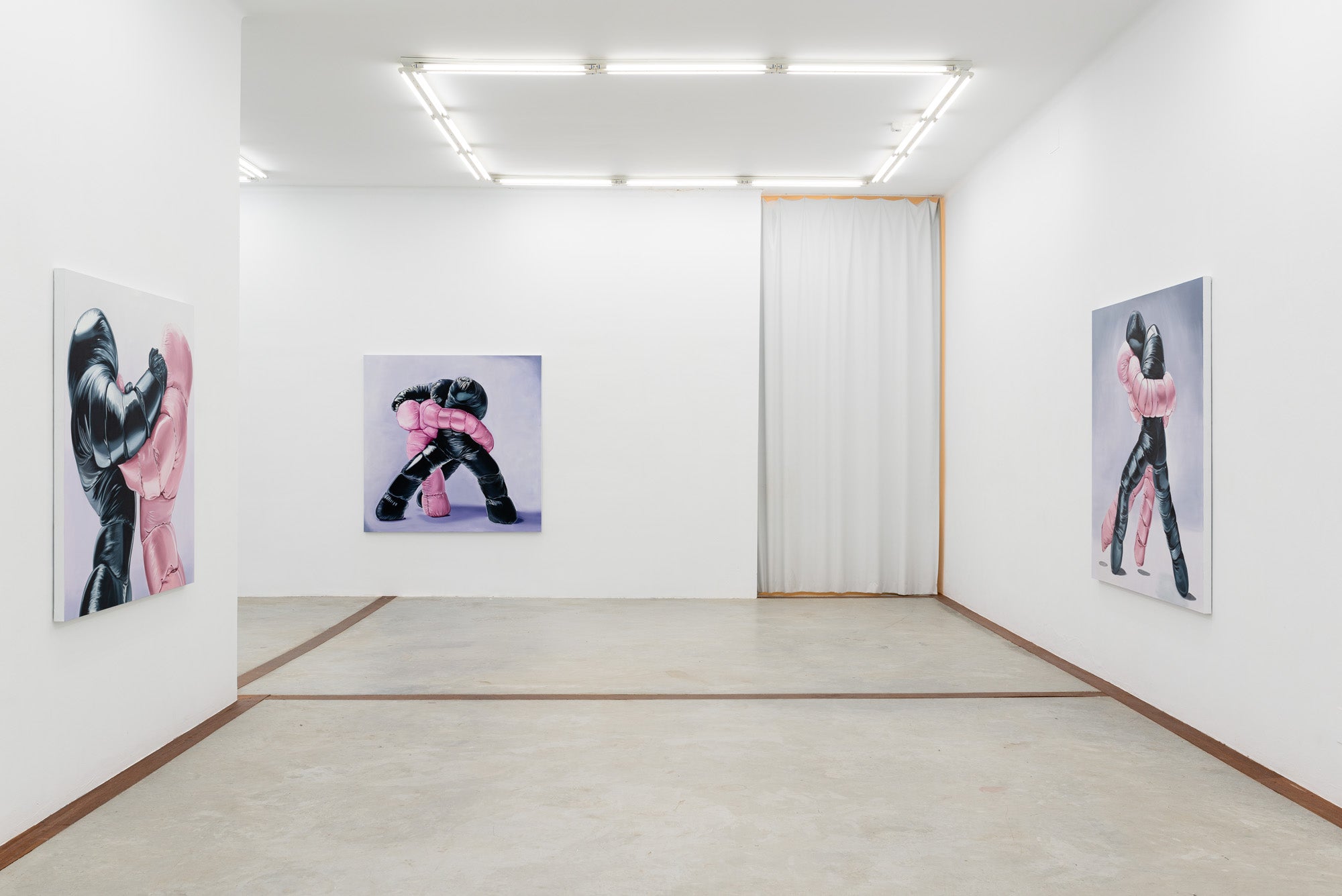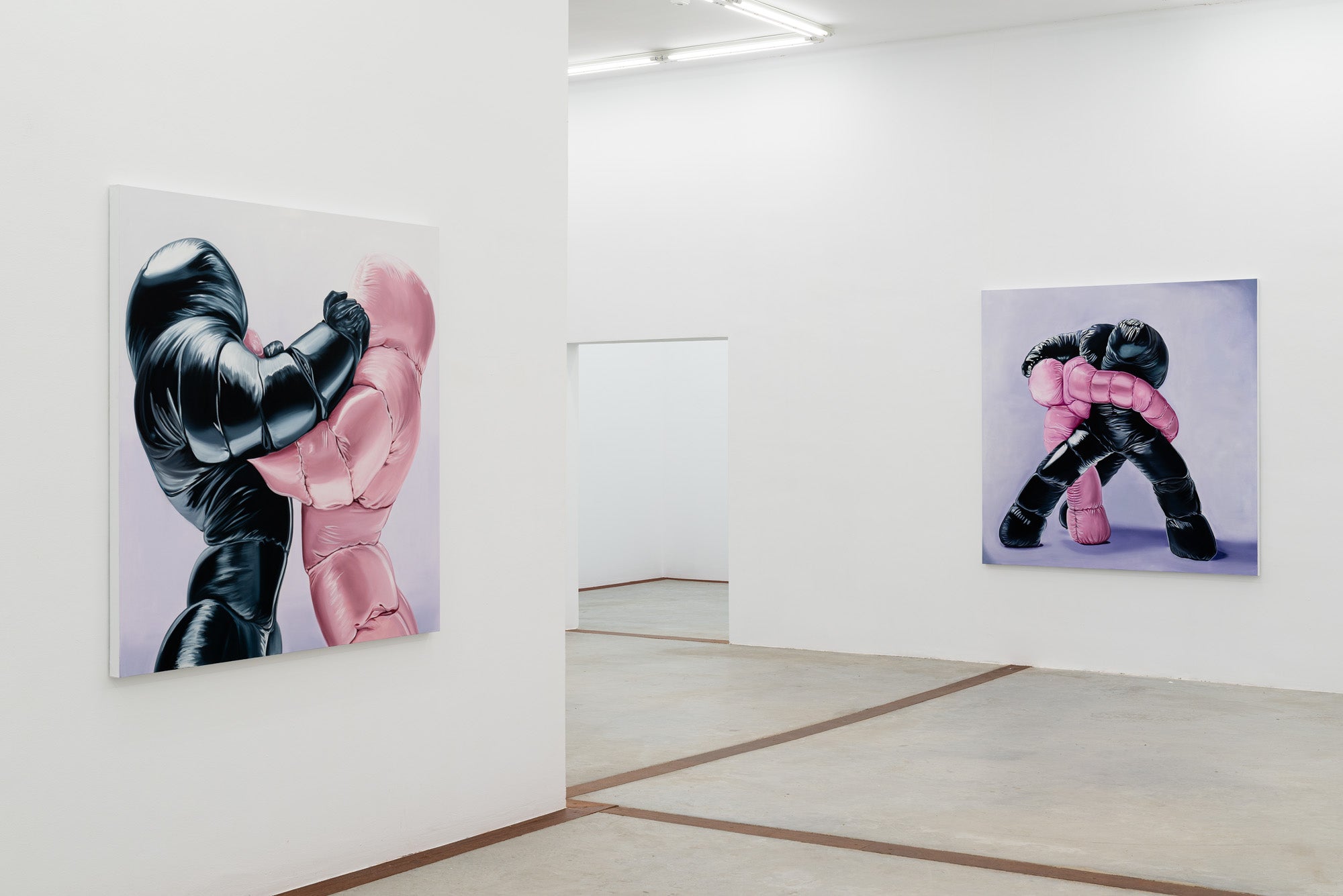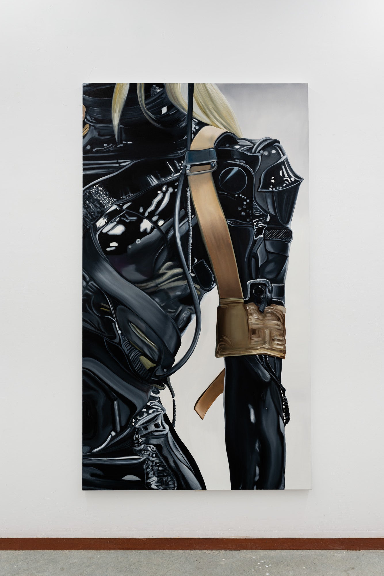 Stein’s paintings present figures and things that hover between the fetishistic and the familiar: a latex-coated torso, a gloved hand steadying a needle, padded beings locked in a tender, uncanny embrace. These bodies — gleaming, distorted, half-humanoid — resist simple readability. They become objects among objects, containers for tension, desire, control and surrender.