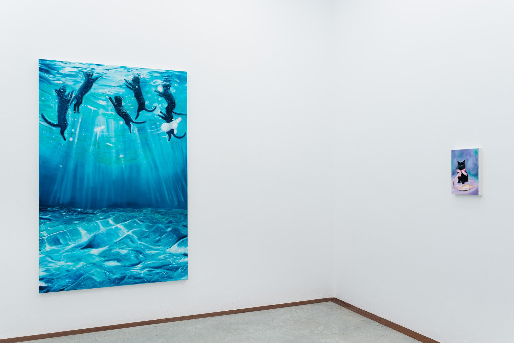 The work moves through registers of intimacy and distance. The surface of a slick suit becomes an archive for touch; the padded, cartoonish figures clinging to each other store tenderness like heat inside synthetic fibers. Even the black swimming cats drifting below the surface hold a secret mnemonic charge: snapshots of an impossible moment that painting alone can fix in place.