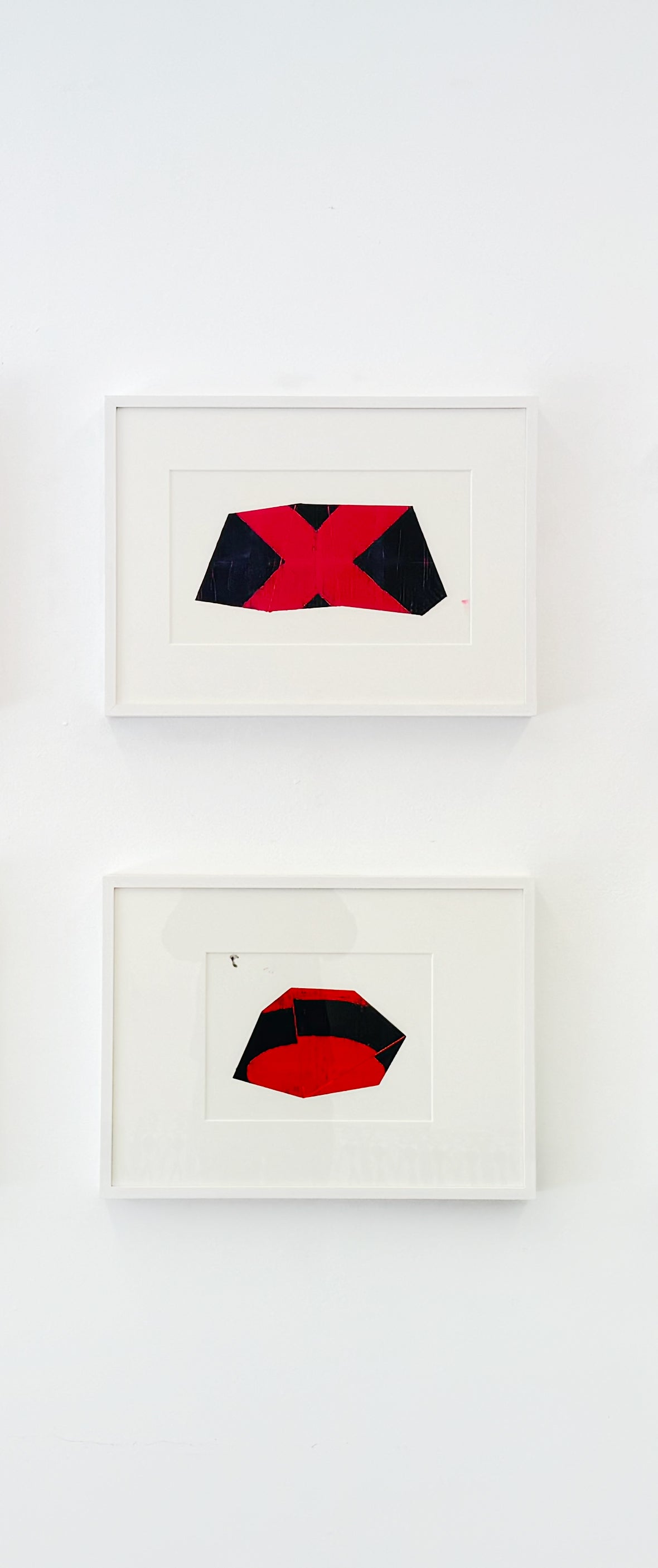 Row leaves parts of his recurrent shapes – the big ellipses and Xes – outside of the irregular physical boundaries of the work, leaving to the viewer’s eye the chance to complete the missing parts, extending them outside of the perimeter to occupy the surrounding space, activating it and making it an integral part of the work.
